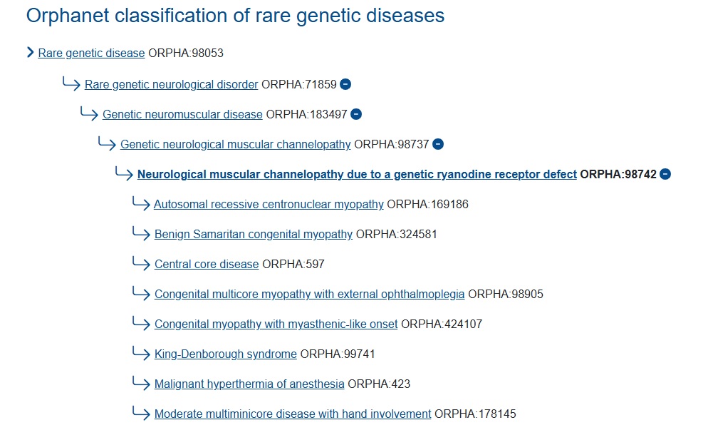 “Doenças Relacionadas ao RYR1 – RYR1-RD” é um termo abrangente que engloba uma gama de subtipos relacionados ao RYR1 que afetam o sistema neuromuscular em humanos. O Orphanet, ( https://www.orpha.net/ ) banco de dados europeu de doenças raras, lista diversas condições relacionadas ao gene RYR1 (figura a seguir):