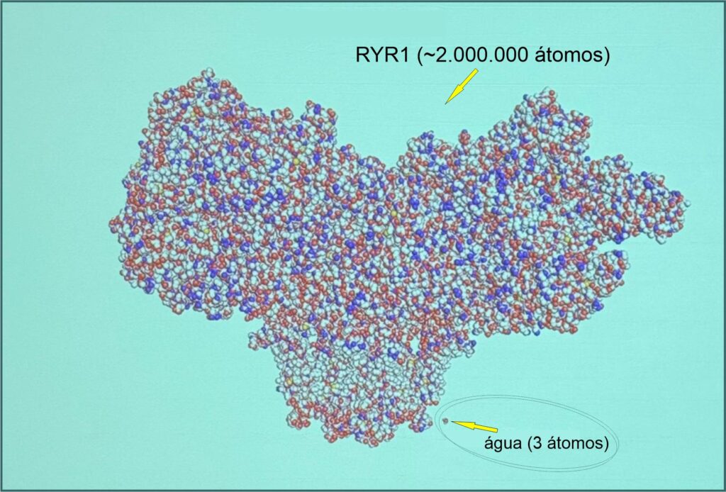 Para se ter uma idéia da complexidade do RYR1, ele é imensamente maior e mais complexo do que moléculas simples como da água, tão crucial para nossa vida, e a título de comparação, pasmem ! …o RYR1 tem 2 milhões de átomos, e a água, também conhecida como H20, tem somente 3 átomos.